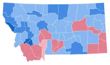 As of the 2020 presidential election, this is the last election in which the following counties have voted for a Democratic presidential candidate: Yellowstone, Flathead, Ravalli, Park, Custer, Richland, Fergus, Granite, Powell, Teton, Carbon, Chouteau, Wheatland, Judith Basin, Pondera, Golden Valley, Toole, Liberty, Treasure, Musselshell, Phillips, Daniels, and Petroleum.[1]