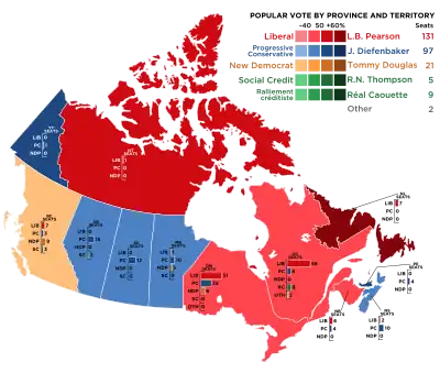 | Liberal | Lester Pearson | 265 | 128 | 128 | 131 | +2.3% | 3,099,521 | 40.18% | -1.34pp | |