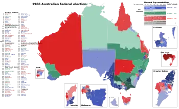The 1966 Australian federal election was held in Australia on 26 November 1966. All 124 seats in the House of Representatives were up for election. The incumbent Liberal–Country coalition government, led by Prime Minister Harold Holt, won an increased majority over the opposition Labor Party, led by Arthur Calwell, in a landslide.[1] This was the first and only time that a Federal Government won an eighth consecutive term in office.