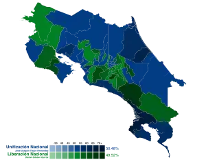 In one of the most hard-fought elections in Costa Rica's history, Trejos won by a small difference of around 2000 votes (one of Costa Rica's slightest differences between two candidates),[3] though PLN kept its parliamentary majority (thus many of Trejos’ reforms did not passed). Far-right Revolutionary Civic Union Party won two seats in Parliament. The results were accepted by all sides and many historians seem this election as the evidence that the dark times of civil unrest and conflict after electoral processes that end in the Civil War were put behind for good.[3]