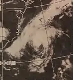 In the wake of Hurricane Camille, a quasi-stationary front moved across the Southern United States and became situated over North Florida. A cut-off low pressure area developed along the system and acquired a low-level circulation.[4] By 0000 UTC on August 25, the system was classified as a tropical depression while located about 100 mi (160 km) east of Jacksonville, Florida.[2] Due to cold air in the region, the depression strengthened slowly while tracking nearly due east. Late on August 25, it was upgraded to Tropical Storm Eve.[4]