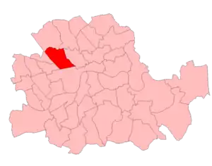 ![]() A map of parliamentary constituencies within the County of London at the time of the by-election, with St Marylebone highlighted in red. | |||||||||||||||||||||||||
