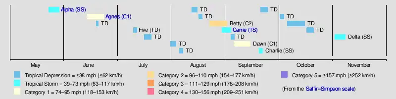 Tropical cyclogenesis first occurred in the month of May, with the development of Subtropical Storm Alpha. The month of June featured three tropical cyclones, including Hurricane Agnes and two tropical depressions. Three more systems formed in July, though all of them failed to reach tropical storm status. August was the most active month of the season, with five systems, including Hurricane Betty, Tropical Storm Carrie, and three tropical depressions. September featured slightly less cyclogenesis, with Hurricane Dawn, Subtropical Storm Charlie, and two tropical depressions. An additional three tropical depressions formed in October. Subtropical Storm Delta was the sole system in November, lasting from November 1 to November 7.[5]
