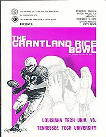 The 1972 Grantland Rice Bowl was an NCAA College Division game following the 1972 season, between the Louisiana Tech Bulldogs and the Tennessee Tech Golden Eagles.[2] Louisiana Tech quarterback Denny Duron was named outstanding offensive player, while his teammate linebacker Joe McNeely was named outstanding defensive player.[3]