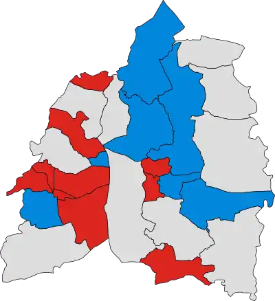 ![]() Map of the results of the election. Colours denote the party achieving the highest number of votes in each ward. | |||||||||||||