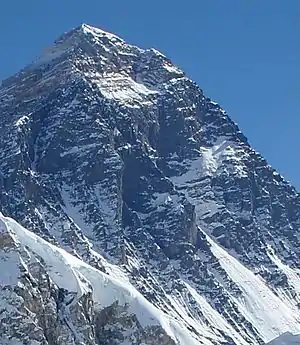 Mount Everest's Southwest Face. Nuptse obscures the view at the lower right.[note 1]