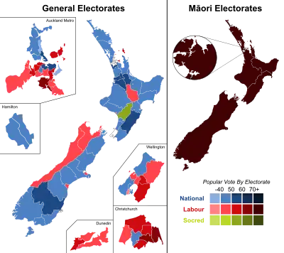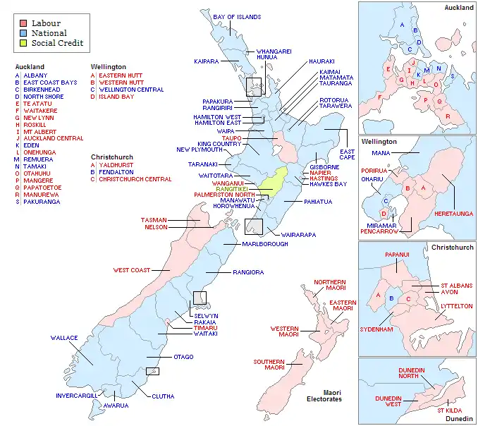 While National won a majority of seats in parliament, it did not actually win a majority of the vote. Labour received the highest number of votes, winning slightly more than forty percent. National, by contrast, won slightly less than forty percent. Social Credit, despite winning only one seat, actually received around sixteen percent of the vote. The election night result had National with more seats, but many seats had small majorities and it was conceivable that if special votes overturned enough electorates Labour could form a government.[15] Ultimately this did not eventuate however.