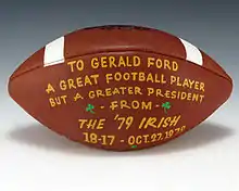 A football gifted by the Notre Dame Fighting Irish football team to President Gerald Ford, commemorating their 18–17 victory over South Carolina on October 27.