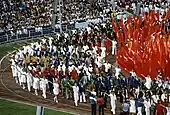 • Vertical red flags with the emblem of the Moscow Olympics on them entered, along with marshals and linemen. The card stunt was then showing the Moscow Olympics logo, with rays spreading from it.