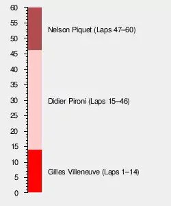 Gilles Villeneuve took the early lead until an ill-fated pit stop for slick tyres, whereafter Didier Pironi held the lead until late in the race and was passed by Nelson Piquet, who eventually won the race. As well as being Michele Alboreto's Grand Prix debut, the race is also notable for the recovery of Gilles Villeneuve to seventh place, after misjudgement of tyre selection for the conditions. While the team did not qualify for the race, it was the first race entered by Toleman, which is now Alpine F1 Team.