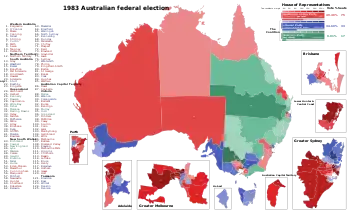The 1983 Australian federal election was held in Australia on 5 March 1983. All 125 seats in the House of Representatives and all 64 seats in the Senate were up for election, following a double dissolution. The incumbent Coalition government which had been in power since 1975, led by Malcolm Fraser (Liberal Party) and Doug Anthony (National Party), was defeated in a landslide by the opposition Labor Party led by Bob Hawke.
