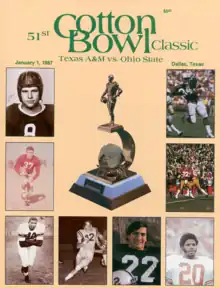 The 1987 Cotton Bowl Classic was the 51st edition of the college football bowl game, played at the Cotton Bowl in Dallas, Texas, on Thursday, January 1. Part of the 1986–87 bowl game season, it matched the eleventh-ranked Ohio State of the Big Ten Conference and the #8 Texas A&M Aggies of the Southwest Conference (SWC).[2] A slight underdog,[1] Ohio State won by sixteen points, 28–12.[3][4]