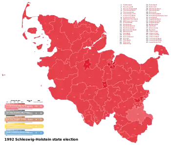 The 1992 Schleswig-Holstein state election was held on 5 April 1992 to elect the members of the Landtag of Schleswig-Holstein. The incumbent Social Democratic Party (SPD) government led by Minister-President Björn Engholm narrowly retained its majority by a margin of one seat. The major change of the election was the entry of the national conservative German People's Union to the Landtag. The Free Democratic Party also re-entered the Landtag, while The Greens failed to surpass the threshold by a margin of 0.03%.