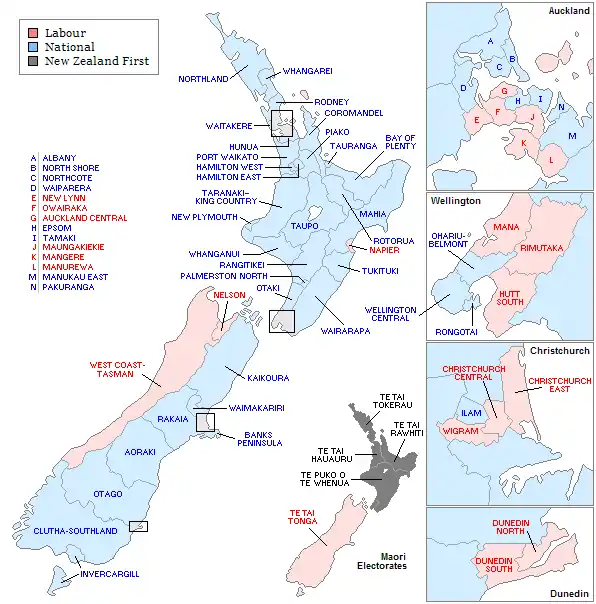- The seats of Albany, Otago, Rotorua and Waitakere, all held by departing National MPs, were won by new National candidates. One departing MP retired, one was re-elected in a different electorate, and two became list MPs.