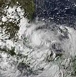 Interaction between a strong monsoon-type flow and a tropical wave in the Bay of Campeche resulted in the development of Tropical Depression Seven on September 5. By 00:00 UTC on September 6, the depression attained maximum sustained winds of 35 mph (56 km/h) and a minimum barometric pressure of 1,006 mbar (29.7 inHg).[13] Shortly thereafter, the center of circulation of the depression became difficult to locate, but was likely heading north-northwestward. Due to warm ocean temperatures, the SHIPS model predicted further intensification, despite the storm having almost no deep convection and being close to land.[58]