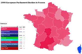 European Parliament elections were held in France on 13 June 1999. Once again, abstention was very high for this type of election- only 47% of eligible voters voted. The election was also the first French European election to be won by the Socialist Party (PS).