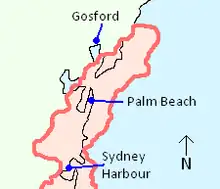 The storm cell formed at 4:25 pm AEST to the north of Nowra, roughly 115 km (71 mi) south-southwest of Sydney. After forming, it initially headed towards the coast in a northeasterly direction. The cell passed just to the west of Kiama at around 5:15 pm and gained a 'severe' classification from the Bureau of Meteorology at the same time.[15] 'Severe' is a classification used by the Bureau of Meteorology for thunderstorms which meet a specific criteria, namely producing hailstones with a diameter of 2 cm (0.8 in) or more, wind gusts of 90 km/h (56 mph) or greater and flash flooding, or tornadoes. This classification is also used by the Bureau to classify the attributes of a storm at any given time during its life.[7][16]