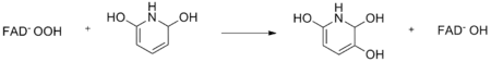 Another reaction of 2,6-dihydroxypyridine highlights its function as a substrate for oxygenase. One example is the enzyme monooxygenase, which oxidizes the substrate by transferring one oxygen atom of O2 to the substrate. The other oxygen atom is reduced to water. The product of the oxidase reaction was determined to be 2,3,6-tri-hydroxypyridine because of the results of the stoichiometry as well as the results of the ultraviolet spectrum. This reaction can be shown by the following equation: