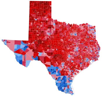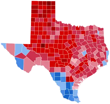 Bush carried 230 of Texas's 254 counties. He racked up big margins in the Texas Panhandle, East Texas, the Permian Basin, the Texas Hill Country, and the Gulf Coast. He won every major and mid-sized city with the exceptions of El Paso, Laredo, Brownsville, McAllen, and Beaumont, all of which were carried by Vice President Al Gore. Two thinly populated counties, Glasscock and Ochiltree, gave Bush over 90% of the vote, with the former being the strongest Republican voting county in 2000.[5] This marked the first time since 1956 that a Republican candidate won any of Texas's counties with over 90% of the vote, and the first time since Texas native Lyndon B. Johnson in 1964 any candidate has done so.
