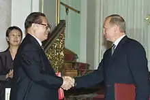 Jiang Zemin and Vladimir Putin after signing the FCT