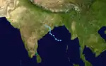 Toward the end of April, an area of convection persisted in the southern Bay of Bengal.[4] It developed into a distinct low-pressure area on May 1 over the body of water, but soon moved westward into India without developing. On May 4, the system emerged from Kerala into the Arabian Sea,[1] and soon after convection rapidly increased. Early on May 5, the JTWC classified the system as Tropical Cyclone 01A about 370 km (230 mi) west-southwest of Kochi, India.[4] On the same day, the IMD began classifying it as a depression, but soon after upgraded it to a deep depression and later cyclonic storm after increased organization.[1] The storm meandered off southwest India for three days due to weak steering currents. During that time, the convection pulsed around the circulation,[4] and the IMD upgraded it to a severe cyclonic storm on May 7 with winds of 100 km/h (60 mph).[1] By contrast, the JTWC only estimated peak winds of 85 km/h (55 mph).[2] Increased wind shear, cooler waters, and dry air rapidly weakened the convection, exposing the center and causing the storm to deteriorate quickly into a depression. On May 10, the system degenerated into a remnant low off Gujarat, without any discernible low-level circulation.[1][4]