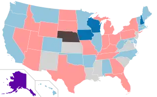 Democrats flipped ten legislative chambers. Democrats gained control of the Oregon House of Representatives, the Minnesota House of Representatives, both houses of the Iowa General Assembly, and both houses of the New Hampshire General Court for the first time since 1875, giving them complete legislative control over those states. The Iowa Senate was previously tied. Democrats also won majorities in the Wisconsin Senate, the Michigan House of Representatives, the Pennsylvania House of Representatives, and the Indiana House of Representatives, turning those legislatures into split bodies.[1] Additionally, a Democratic-led coalition was created in the Alaska Senate, which was previously a Republican majority.[2] Democrats won a majority of state legislative chambers for the first time since 1995.