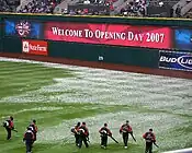 However, their home opener, as well as the remainder of a four-game series with the Seattle Mariners, was postponed due to heavy snow. After a discussion about a possible relocation of the following series between the Indians and the Angels to Anaheim,[3] the Indians decided to relocate the three-game series to Miller Park in Milwaukee.[4] The three-game series averaged a surprising 17,498 fans in attendance, and featured several homages to the fact that the film Major League was shot in Milwaukee, including closer Joe Borowski entering the game to "Wild Thing".