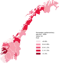 On election day, an opinion poll conducted by Dagens Næringsliv predicted 1.9% of the vote for Red.[67] It actually obtained 1.3% (36,219 votes), making it the largest party outside Parliament.[68] 12,000 of those votes came from Oslo. In the municipality of Hordaland, Red garnered 2.5% of the vote, a decrease of 0.9% from the 2005 election. Red increased its voter share in Troms, in Nordland and in Telemark. Dahle acknowledged to the media that neither he nor his party were pleased by the results. He remained optimistic, however, calling the results a "good starting point".[69]