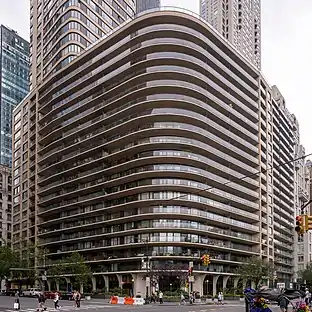 200 Central Park South is a Modern-style building on the south side of Central Park in Midtown Manhattan, New York City, at the corner of 7th Avenue and Central Park South (59th Street). It is most notable for its curving facade, banded by balconies. Its exterior is beige brick and glass.[1] It is across from a major pedestrian and vehicle entrance into Central Park, known as the "Merchant's Gate".[1] This full service building was completed in 1963 by Bernard Spitzer and Melvin Lipman.[lower-alpha 1] It was designed by Wechsler & Schimenti.[1]