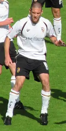 October opened with a dismal home draw with Dagenham & Redbridge, with goalkeeper Chris Neal making an uncharacteristic error to allow a blunted "Daggers" attack to claim an unlikely goal.[11] The team then rallied to produce a convincing 2–0 win away at fourth-placed Exeter City, Pope's two goals taking him into double figures with 35 league games yet to play.[11] However, injuries took hold of the small squad, with captain Loft sidelined with a calf injury,[14] and winger Lewis Haldane forced to announce his retirement after failing to recover from a broken leg he sustained in August 2011.[15] They played Oxford United on a Monday night in front of the Sky Sports cameras, and did themselves justice with a convincing 3–0 win, with both Ashley Vincent and Sam Morsy scoring impressive goals.[11] An injury/suspension crisis in midfield then did little to prevent a patched up Vale side to come from behind to beat Gareth Ainsworth's Wycombe Wanderers 4–1.[11] They then travelled to Staffordshire rivals Burton Albion, and battled to a 1–1 draw after falling behind to a fluke goal.[11] The month ended on a sour note at Sixfields, as John McCombe was sent off after breaking the leg of Northampton Town goalscorer Alex Nicholls; injuries and suspensions left teenagers Joe Davis and Kingsley James to form a makeshift centre-back partnership, though the score was kept to a respectable 2–0.[11] For a second-successive time, a Vale player was named the division's Player of the Month; Ashley Vincent took the award, but credited his teammates, saying "this award is as much for them as it is for me".[16]