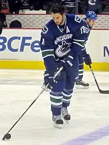 With training camp starting on January 13, 2013, Vancouver recalled 12 players from the Wolves.[38][39] They also bolstered their defence corp by signing NHL veterans Jim Vandermeer and Cam Barker to one-year contracts.[40] At the forward position, the Canucks were dealing with injuries to their second line. Centre Ryan Kesler, who was recovering from off-season surgeries to his shoulder and wrist, would be unable to start the season; it was unknown how long he would be out rehabbing the injuries.[41] Winger David Booth was injured during the team's physicals to start camp.[42] After having an MRI done on his injury, it was announced that Booth would miss four to six weeks recovering.[43] Alain Vigneault stated that he hoped to keep his third and fourth lines intact, leaving the possible replacements as, Andrew Ebbett, Jordan Schroeder and Zack Kassian. Schroeder was a first-round draft pick for Vancouver in 2009, but had never played in an NHL game. Ebbett a utility, journeyman forward played in 18 games for Vancouver in 2011–12. While the second-year Kassian produced only four goals in his rookie campaign.[44] Vancouver elected to start the season with Ebbett and put Kassian on their second line.[45] In order to keep defensive depth, the Canucks decided to keep nine defenceman. Schroeder was sent back to the minors in order to comply with the 23-man roster and because he would not need to clear waivers.[46]