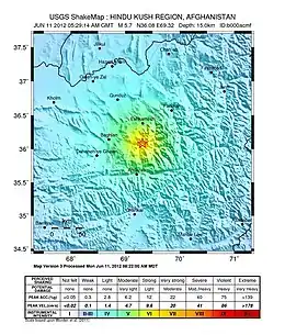 The first earthquake struck at 09:32 local time (05:02 UTC), registering a magnitude of 5.4 at 15 kilometres (9.3 mi) depth. A second quake struck 25 minutes later, measuring 5.7 magnitude.[7] The epicenter of both quakes was approximately 160 kilometres (99 mi) southwest of Fayzabad.[7] The quakes could be felt 170 kilometres (110 mi) away in the capital of Kabul.[8]