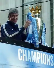 Manuel Pellegrini with the Premier League trophy during the club's victory parade, May 2014.
