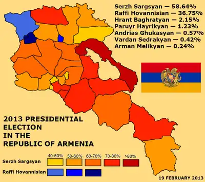 Presidential elections were held in Armenia on 18 February 2013. In the run-up to the elections, Armenia's first President Levon Ter-Petrosyan and Gagik Tsarukyan, leader of the second largest parliamentary party Prosperous Armenia, withdrew from the race in December 2012. Many believed that no candidate would be able to challenge incumbent President Serzh Sargsyan, others stated that people see "absence of alternatives" and these factors caused great apathy among the public.[1][2]