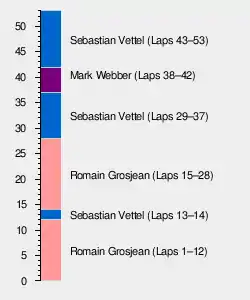 At the start, Romain Grosjean made a superb start to lead into the first corner, behind him there was drama with Mark Webber making contact with Lewis Hamilton causing the latter to have a puncture, also there was a collision between the Marussia of Jules Bianchi and the Caterham of Giedo van der Garde sending both cars into the barriers at the first corner, fortunately both cars were removed quickly so no safety car was needed. Hamilton pitted to change his punctured tyre but retired on lap 7 with floor damage. Grosjean led until the pit stops but careful tyre management from Sebastian Vettel during the second phase of the race meant he was able to pass Grosjean and go on to win the race. On the penultimate lap Webber then caught and passed Grosjean to make it a Red Bull 1-2, with Grosjean having to settle for 3rd. Fernando Alonso claimed 4th with Nico Hülkenberg in fifth. Kimi Raikkionen managed 6th although he was some 40 seconds behind his teammate Grosjean. Esteban Gutierrez had the strongest race of his career with 7th beating Nico Rosberg who had to serve a drive through penalty for an unsafe release in the pits.[9]