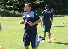 A trip to Fleetwood Town on 4 October proved fruitless after a late penalty gave Fleetwood a 1–0 win; Vale had played well and seemed to have done enough to earn a point despite playing much of the match with ten men after Slew was sent off for striking an opposition player.[35] In search of a first clean sheet of the season, Page signed 19-year-old centre-back Remie Streete on loan from Newcastle United.[36] Vale came out of the relegation zone on 11 October with a convincing 4–1 win over struggling Yeovil Town.[37] A 2–0 defeat followed at Deepdale, with Zubar receiving a straight red card for lashing out at Preston North End's Joe Garner.[38] After the game Page condemned Garner for play-acting throughout the match to try and get Vale player's sent off.[39] The loan signings continued, as Leicester City's Saint Kitts and Nevis international striker Harry Panayiotou arrived on a one-month loan.[40] The club were also in talks with former Premier League midfielder Isaiah Osbourne, who instead joined fellow relegation battlers Scunthorpe United.[41] Ironically a few days later Scunthorpe then came to Burslem, as did the remnants of Hurricane Gonzalo, and the game ended 2–2 despite the Vale leading 2–1 and facing ten men after former player Jennison Myrie-Williams was sent off.[42] The fifth signing of Page's reign then arrived in the form of French striker Dany N'Guessan, who signed a two-month deal.[43] The signing came in good time as Tom Pope was later ruled out of action for a few weeks with a knee injury.[44] Vale then beat Leyton Orient 3–0, keeping their first clean sheet of the season; Orient were reduced to ten men early in the first half after Darius Henderson was sent off for elbowing Richard Duffy.[45] Having taken the club up seven league places within six weeks, Page was appointed as manager on a permanent basis on 29 October.[46]
