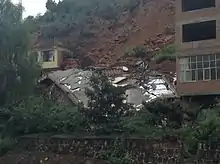 The 2014 Ludian earthquake struck Ludian County, Yunnan, China, with a moment magnitude of 6.1 on 3 August.[10] The earthquake killed at least 617 people, injuring at least 2,400 others.[11][12] As of 5 August 2014, 112 people remain missing.[13] Over 12,000 houses collapsed and 30,000 were damaged.[14] According to the United States Geological Survey, the earthquake occurred 29 km (18 mi) WSW of Zhaotong city at 16:30 local time (08:30 UTC).[15][16][17]