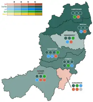 ![]() Mid Ulster 2014 Council Election Results by DEA (Shaded by plurality of FPVs) | ||||||||||||||||||||||||||||||||||||||||