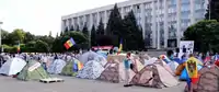 Clashes broke out with police at the prosecutor general's headquarters, where activists attempted to set up an occupy-style tent encampment.[8] Opposition leaders have accused the prosecutor general of being an instrument of political persecution. Supporters of the radical left Red Bloc Party tried to break the police cordon and forcibly enter the prosecutor's office.[61] Police detained seven activists,[62] including Antifa movement leader, Grigory Petrenko.[63] A team from a local television station in Moldova was accosted by demonstrators.[64] Likewise, six policemen were injured and one woman was hospitalised. According to Interior Minister Oleg Balan, "their scope was to devastate the prosecutor's office".[65] Police removed tents in front of the prosecutor's office.[66] However, more than 90 tents were set up by protesters in Grand National Assembly Square, vowing to continue their protest until demands are met.[67][68]