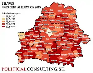 Presidential elections were held in Belarus on 11 October 2015.[1] Long-term president Alexander Lukashenko ran for his fifth term in office, having won every presidential election since independence in 1991. He was re-elected with 84% of the vote, according to official figures. The 'against all' option received more votes than any opposition candidate.