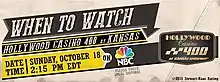29. 1 2 3 4 5 6 7 "2015 Hollywood Casino 400". Sprint Cup Series. Season 67. Kansas City, Kansas. October 18, 2015. Event occurs at 2:34 p.m. NBC Sports. NBC. Retrieved October 26, 2015.