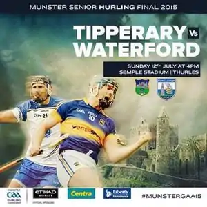 The 2015 Munster Senior Hurling Championship Final was a hurling match which was played on 12 July 2015 at Semple Stadium, Thurles. The winners would advance to the semi-finals of the All-Ireland Senior Hurling Championship, with the loser going into the All Ireland quarter-finals. Tipperary and Waterford contested the final with Tipperary winning the title on a 0-21 to 0-16 scoreline.[2] The win was Tipperary's 41st Munster Senior title and first since 2012.[3][4][5][6]
