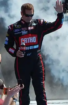 The race restarted with 10 laps to go. While Hamlin was unable to pull away from the field as had been the norm in the last few years, he was able to hold off a hard charging Kevin Harvick to score the victory in the Sprint All-Star Race.[25] It was the fifth straight year that the winner of the race restarted either first or second in the final 10 laps.[26] "In the middle part of the race, I thought we were out to lunch," Hamlin said. "With 50 (laps) to go, I didn’t see this coming. But the pit crew knocked it out of the park – a primetime, under-pressure performance that won us the race. Then, we had to hold off the "4" (Harvick), which we haven’t been able to do the last two years. Everything came together perfectly for that last 10 laps."[27] Jeff Gordon finished fourth in his 22nd and final All-Star Race.[28] Kyle Busch finished sixth in his first Sprint Cup Series race since Homestead last November.[29] "I felt like I got of the car after 100 laps and I'm fine," Busch said. "Am I going to die out after 200 or 300? I don't know, but the plan is to the full distance."[29] After restarting the race from the tail-end of the field, Brad Keselowski worked his way to a ninth-place finish.[30]