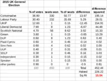 • Scottish National Party (or the SNP): The SNP only contested seats in Scotland and stood in all 59 Scottish constituencies. The party received the second-most votes in Scotland and the sixth-most overall in 2010, winning six seats. It won the 2011 election to the Scottish Parliament and had a surge of support since the Scottish independence referendum in September 2014, in which it was the main political party behind the losing Yes campaign.[35] Most projections suggested that it would be the third-largest party overall after the 2015 election, in terms of seats won, overtaking the Liberal Democrats.[23]