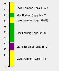 A battle for the lead developed between Hamilton and Ricciardo, until the Australian moved around Hamilton on lap 15. With the grip of the intermediate tyres deteriorating, there were many overtaking manoeuvres on track. Rosberg unsuccessfully tried to overtake teammate Hamilton for second on lap 16, while Verstappen took sixth place from Vettel one lap later, only to run wide and lose the position again. On lap 18, Rosberg moved ahead of Hamilton, who was the first of the front runners to change tyres at the end of the lap, going for a dry compound. The other frontrunners followed suit over the next couple of laps. Following the pit stops, Ricciardo led from Rosberg, Kvyat and Hamilton.[32][34] The two Mercedes drivers moved ahead of their respective Red Bull rivals on laps 22 and 23, while Vettel, now in fifth, closed on the leading quartet. On lap 24, he reached Kvyat and overtook him for fourth, while Rosberg extended his lead to Ricciardo to nine seconds by lap 25. Hamilton took second place from Ricciardo one lap later. At the same time, Kimi Räikkönen was forced to retire.[32] So had Massa on lap 24, suffering the same problem that had forced his teammate to stop.[36]