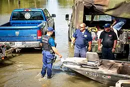 The widespread flooding stranded tens of thousands of people in their homes and vehicles. At least 30,000 people were rescued by local law enforcement, firefighters, the Louisiana National Guard, the Coast Guard and fellow residents, from submerged vehicles and flooded homes.[23] Many boat-owning residents of Louisiana and Mississippi, together with other volunteers, formed an informal rescue service known as the Cajun Navy and navigated through flooded areas to answer calls for help that they received via social media. They rescued as many as a thousand people and pets and distributed emergency supplies.[24][25][26][27] A group of 70 volunteers from St. Bernard Parish conducted hundreds of boat rescues in East Baton Rouge Parish.[15] By August 15, approximately 11,000 people sought refuge in 70 shelters.[28] Flash flooding swamped a 7-mile (11 km) section of Interstate 12 between Tangipahoa Parish and Baton Rouge, stranding 125 vehicles. At one point, an approximately 62-mile stretch was closed because of flooding concerns. State police and the National Guard used high-water vehicles to rescue trapped motorists, but many remained stuck for over 24 hours.[11] A cellular network outage complicated rescues over the affected area.[28] On August 12, a state of emergency was activated for the whole of Louisiana.[29]
