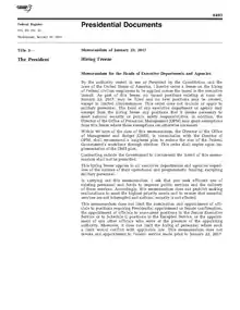 • Institutes a hiring freeze on all positions relating to "Federal civilian employees" that were vacant as of noon on January 22, 2017 (2017-01-22), including creation of new positions;