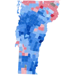 This is the first time Vermont was the strongest state for either party since 1956, when it was Republican Dwight D. Eisenhower's best state. Vermont also saw the largest increase in turnout from 2016, increasing 14.3%.[4] Biden greatly improved on Hillary Clinton's 55.7% vote share and 25.9% margin from 2016, when third-party candidates received over 14% of the vote.[5] Biden's performance was also the fourth-strongest Democratic performance in state history. Trump carried only one county, sparsely-populated Essex bordering New Hampshire, which had voted for the winner from 1980 to 2016. Consequently, Biden became the first president to win without the county since Jimmy Carter in 1976.