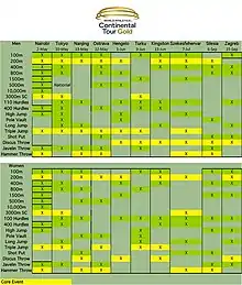 The 2020 World Athletics Continental Tour is an annual series of elite track and field athletic competitions, recognised by World Athletics (formerly known as the IAAF). The Tour forms the second tier of international one-day meetings after the Diamond League[1] except in the 200m, 3000m steeplechase, discus, hammer and triple jump, where it forms the top-tier, these events having been removed from the Diamond League from 2020.[2] 2020 was the series' inaugural season.[3]