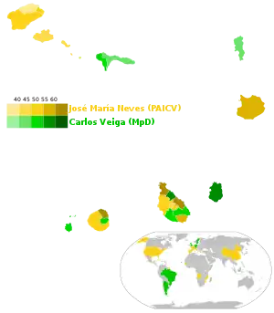The two dominant parties, the PAICV and the Movement for Democracy (MpD),[11] both nominated former prime ministers as their candidates. The PAICV nominated José Maria Neves,[12] and the MpD nominated Carlos Veiga.[13] Veiga ran for the presidency in 2001 (when he lost by just 12 votes out of 153,406 cast in the second round) and 2006 (losing by a margin of less than 2%).